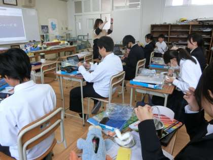 美術室に1年生の皆さんがやってきました。これから「ランプシェード」の制作が始まります。まずは先生から受け取った教材の各パーツが揃っているかを確かめます。これから立体(造形)作品の制作がスタートします。どんな作品が出来上がるか楽しみですね。