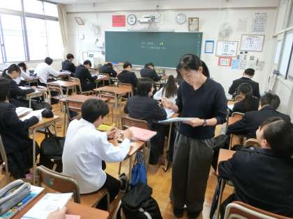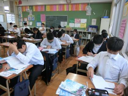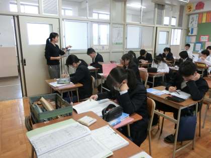 3年生国語の授業で「文章検定」の演習問題に取り組みます。明日、3年生で実施される「文章検定」試験。3級・4級のテストに3年生が挑みます。いくつかの演習問題を解きながら、傾向と対策を講じます。皆さん、検定合格をめざして頑張ってくださいね。