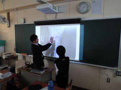 1年3組では、大阪医専の先生による柔道整復師についてです。うでの関節のレントゲン画像をみながら、柔道整復のポイントを教えていただいています。