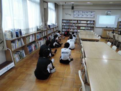 図書室では、大阪医専の先生によるアスレティックトレーナー学科スポーツテーピング講座です。正しいストレッチの仕方や、動かす部位、どうすれば伸ばしたいところが伸びるのか教えていただいています。