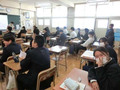 3年生家庭科の授業で「幼児期の成長」について学習します。スクリーンには小さな子が言葉を習得していく過程が映されています。人によって異なりますが、1歳半から2歳頃に急速に言葉を覚えていくそうです。映像のちびっ子もとてもかわいいですね。