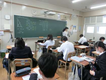 2年生数学の授業で、先生が「図形の証明問題」を解説しています。問題に書かれた仮定をもとに、三角形の性質を活用して問題を解いていきます。今日の問題では「二等辺三角形の底角が等しい」や「三角形の内角の和は180度」の性質を使うそうですよ。