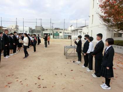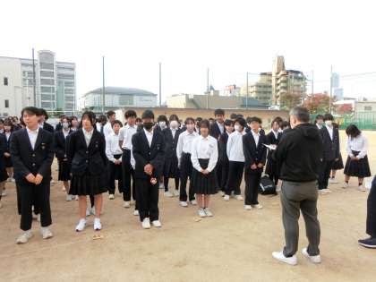 月曜日の朝は全校集会。今朝は運動場に集合し集会を開きました。明日から3日間、期末テストが始まります。(1年生は水・木曜日の2日間)これまでの学習内容を振り返り、納得いく結果が出るよう、しっかりと備えましょう。