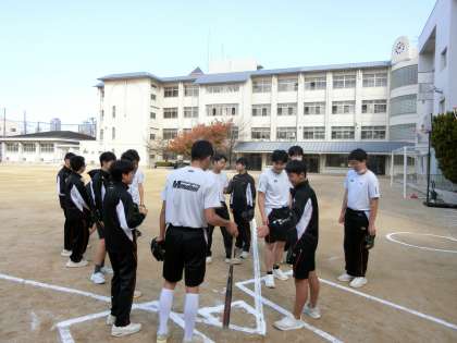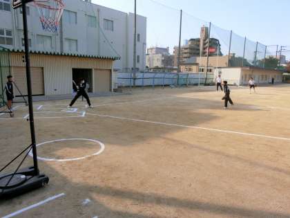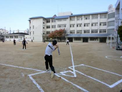 運動場では3年生男子の皆さんがソフトボールの試合を行っています。体育の授業「球技」の一環として、みんなでゲームを楽しみます。ピッチャーが打ちやすいボールを投げてくれるので、気持ちよくバットが振れて快音が運動場に響きます。気持ちよい秋空の下、みんなで楽しい時間を過ごしています。