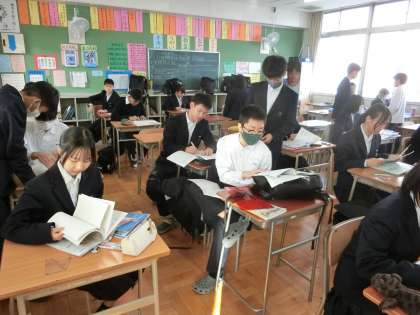 3年生の教室でも、テスト前の追い込みの真っ最中。1時間目のテストは理科。台車の運動や作用・反作用など、物理に関する学習が続きました。授業で教わった問題が出るかもしれませんね。配布されたプリントを改めて確かめてみましょう。