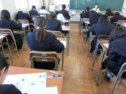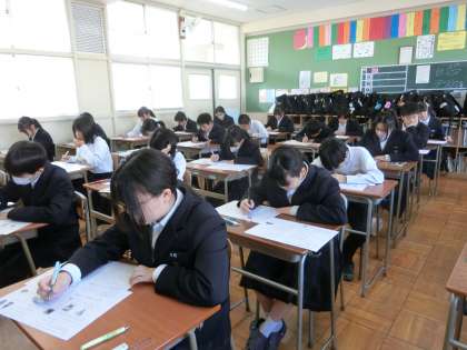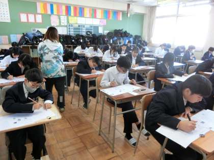 1時間目のテストが始まりました。1年生の皆さんが「社会科」の問題を解いています。今回のテスト範囲は「歴史的分野」が中心。世界の四大文明や、日本の古墳・飛鳥・奈良時代の特徴など、幅広く出題されているようですね。