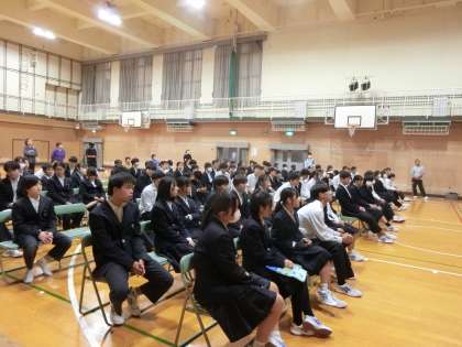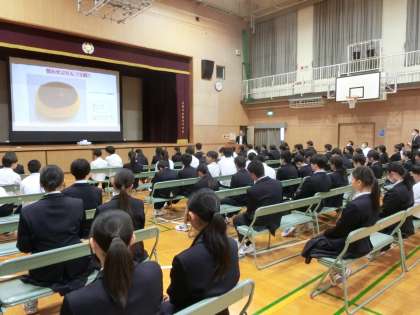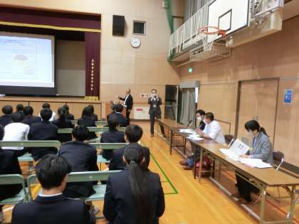 2年生がキャリア教育の一環として取り組んできた「創作パン作り」。桃中祭での販売(完売!)を終え、先週末に振り返り学習を行いました。パンのデザインから商品の販売にいたる取り組みを通して、学んだこと・頑張れたことなどを振り返ります。(株)ダイヤさんも来校され、講評してくださいました。皆さんにとって本当に貴重な体験になりましたね。