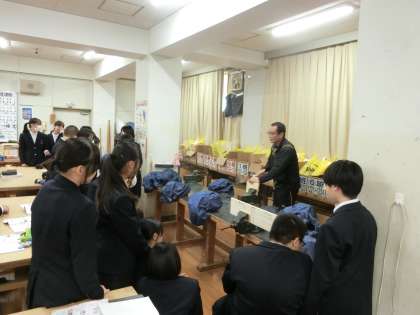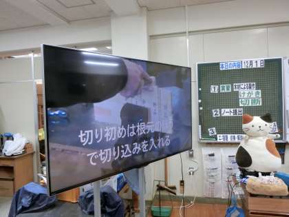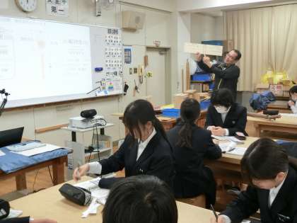 1年生技術科で木工加工の製作実習が始まります。実際の作業に入る前に、先生から手順や工具(ノコギリ)の扱い方の説明がありました。先生の実演を見たり、テレビに映される動画を確かめたり、「安全第一」を意識して実習に取り組みましょう。