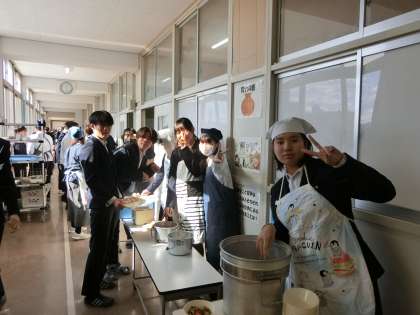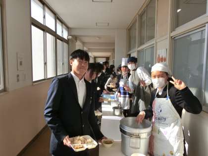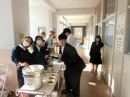 午前の授業が終わり、3年生の教室前で給食の準備が行われています。今日は「鶏と根菜の煮物・かぶの柚子風味・じゃこ豆」の和風メニュー。ジャガイモやゴボウ・ニンジンを鶏肉と一緒に煮込んだ煮物は根菜がたっぷり。根菜は身体を温める効果があるそうです。たくさん食べて温まってね。