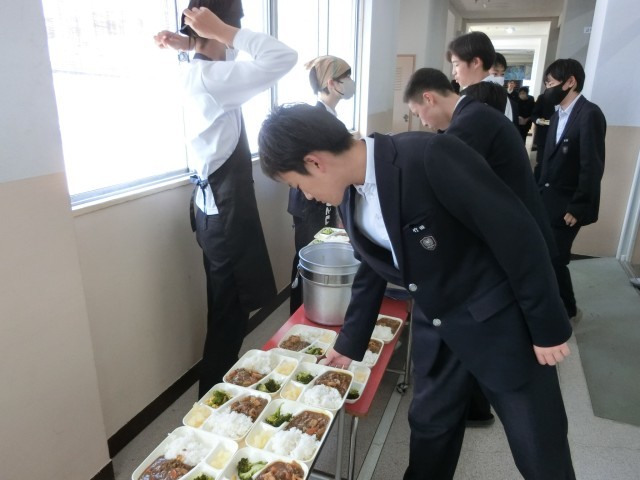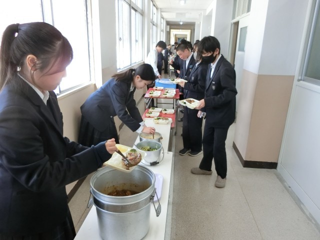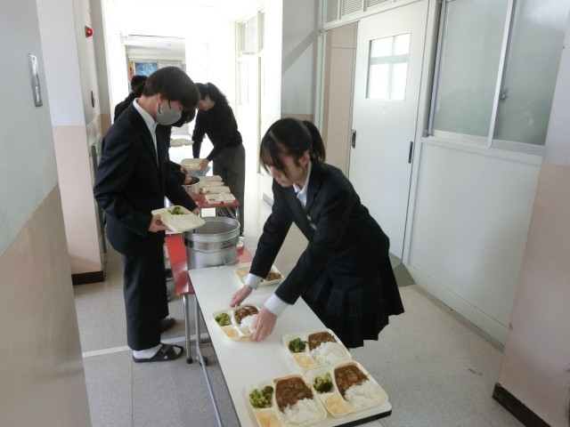お昼休みのチャイムが鳴り、2年生の教室前で給食の準備が始まりました。今日は「冬野菜のカレーライス・ブロッコリーとコーンのサラダ・梨」の人気メニュー。大根やレンコン、ブロッコリーは冬に旬を迎えるお野菜です。皆さん、美味しくいただいてくださいね。