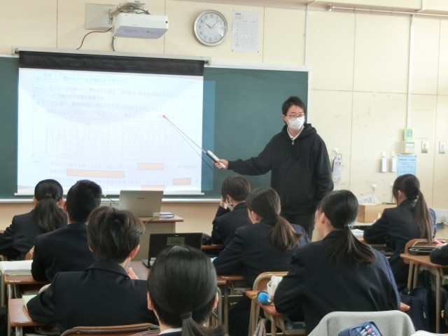 1年生理科の授業で「音の性質」について教わります。音には「大きさ(振幅)」と「高さ(振動)」の2つの性質があります。大きい音は振幅が大きく、高音は振動数が多いそうです。モノコードという器具を使って弦をはじくと、この性質がよく理解できますよ。