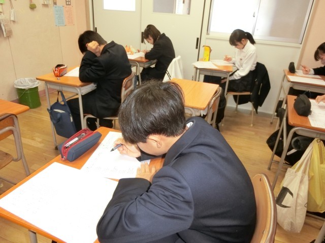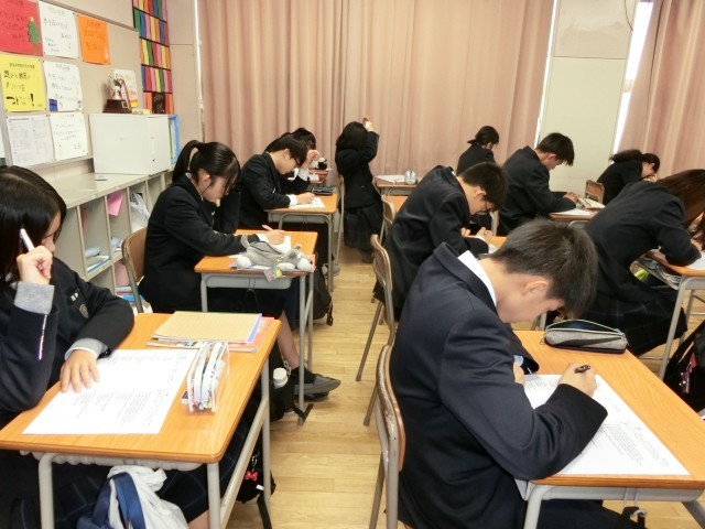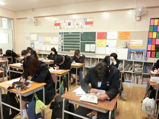 2年生英語の授業でリスニング問題にチャレンジ中。定期テスト等で毎回行われるリスニング問題。音声が流れる前に問題に目を通し、どんな内容が出題されるのか、事前に準備することも正答率を上げるポイントですね。皆さん、一度試してくださいね。