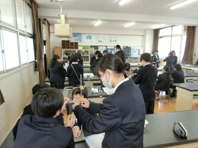 1年生の皆さんが理科室にやってきました。これから「おもりに働く力(重力)とばねの伸び」について実験します。ばねにおもりを吊るして、おもりの重さ(質量)を変えた時の、ばねの伸びの変化を測定します。皆さん協力し合って取り組んでいますね。