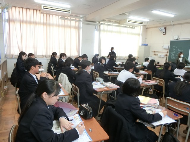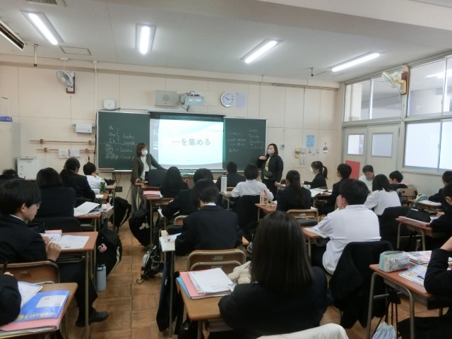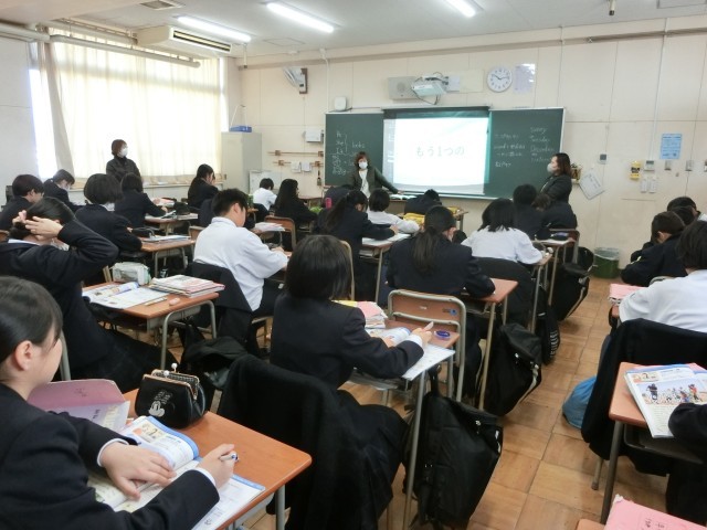 1年生英語の授業にC-NETのベイヤー先生が来られました。今日は先生と一緒に英単語を学習します。「village(村)」や「build(建てる)」 「collect(集める)」など、いろんな単語を教わりました。ベイヤー先生の発音を聞いてアクセントの位置を確かめましょう。