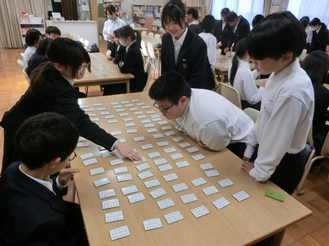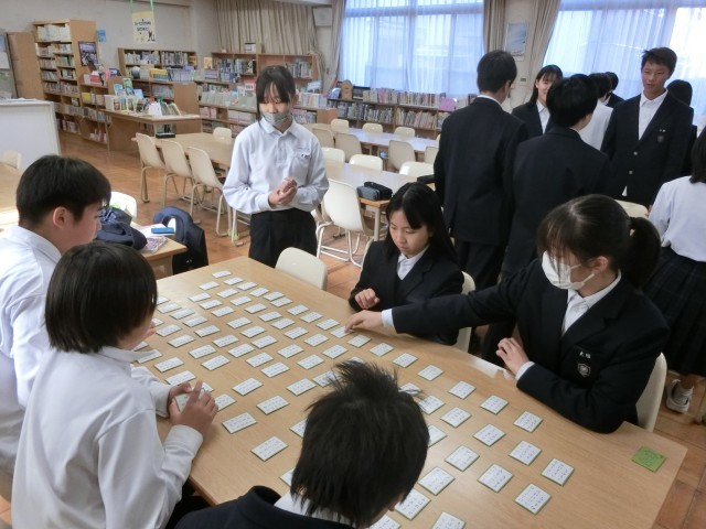 図書室から1年生の皆さんの元気な声が聞こえてきました。いくつかのグループに分かれて百人一首を楽しんでいます。来月1月下旬に学年で「百人一首大会」を開催する予定とのこと。この冬休みにお家で特訓しましょう!!