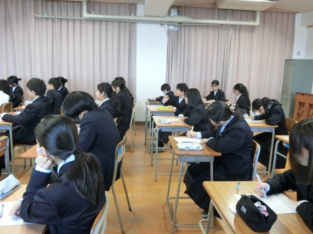 音楽室から美しい合唱曲が聞こえてきました。3学期に行われる1年生の合唱コンクール。今日は4曲ある候補局の中からみんなが歌いたい曲をリクエストで選びます。メロディーや歌詞をよく聞いて、2曲を選ぶとのこと。クラスの特長(カラー)がわかる歌が選ばれると良いですね。