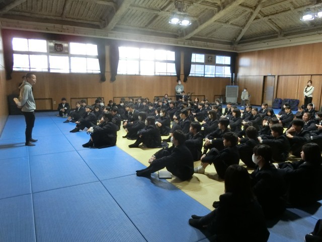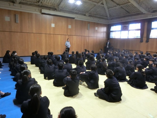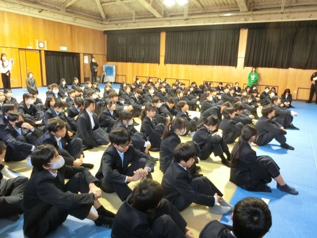 武道場では1年学年集会が行われています。学年の先生方からいろんなお話を聞いています。今学期を振り返る中、自身の成果や課題、次への目標が見えてきましたか?3学期も百人一首大会や合唱コンクールなど、いろんな取り組みが予定されています。みんなと一緒に頑張りましょう!