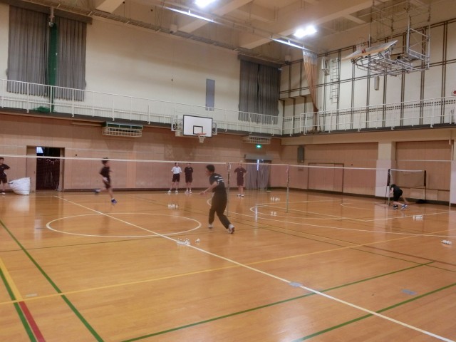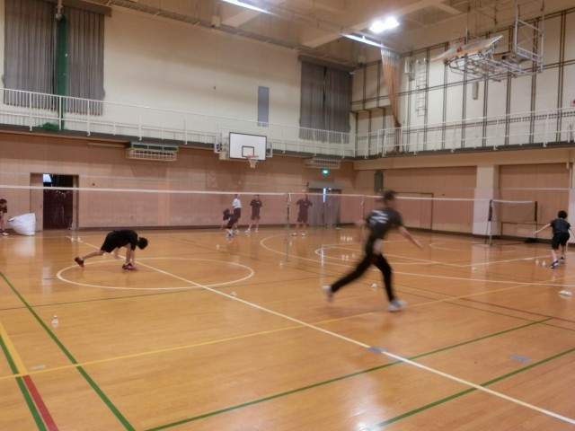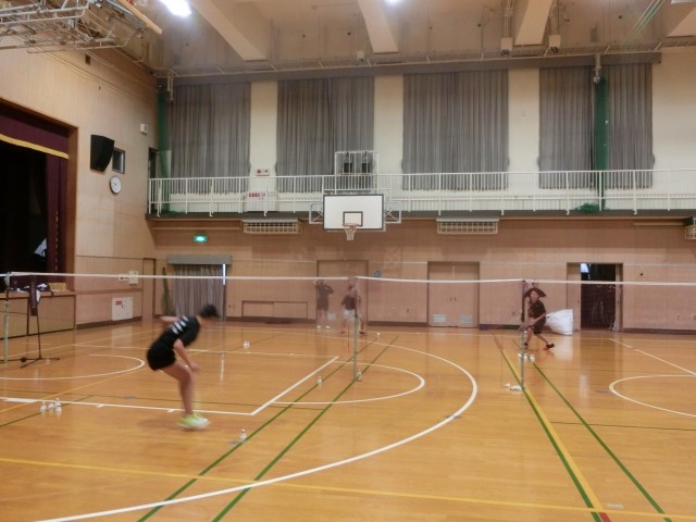 体育館ではバドミントン部が元気に活動しています。現在は「フットワーク」を鍛えるトレーニング中。コート中央にセットしたシャトルを、制限時間内にコートの四隅に次々に運びます。回数を重ねる毎に足腰に負荷がかかります。けっこうキツイ練習ですがみんな頑張っています。