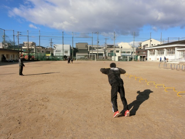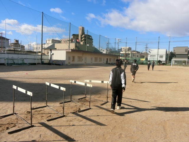 運動場では陸上部の皆さんが練習に励んでいます。まずはウォーミングアップをかねたトレーニングから始めます。柔軟性や瞬発力など、身体の機能を高める動きを繰り返し行います。寒風が吹く中、皆さん元気に頑張っています。