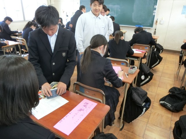 3年3組で3学期の(個人)目標を考えています。先生から短冊が配られ、各々がめざす目標を筆ペンで仕上げます。志望校合格や健康第一を目標に掲げる人が多いようです。中学校生活最後の目標がぜひ達成できますように!