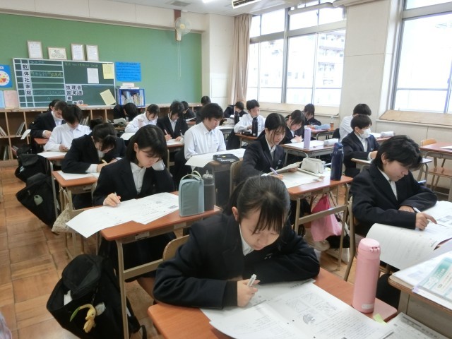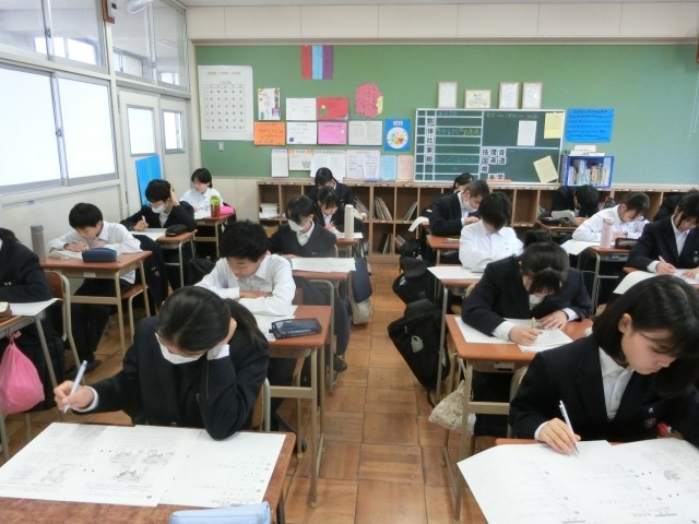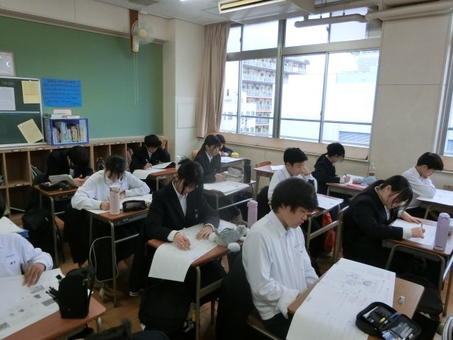 1年生の皆さんが「チャレンジテスト 社会科」の過去問を解いています。明日実施されるチャレンジテスト。どんな感じのテストかを確かめるため、過去に実施された問題に取り組みます。一度やってみると、問題の難易度や出題方法がわかって良いですね。明日の本番にむけて良い練習になりそうです。