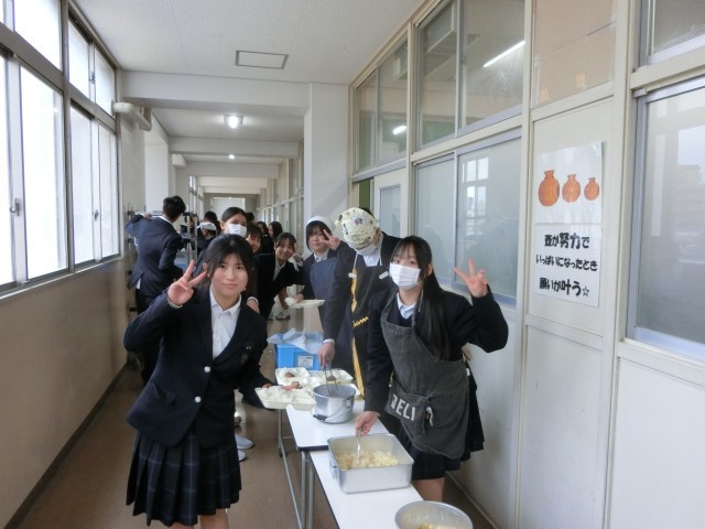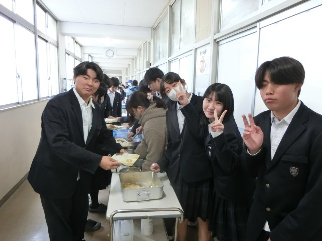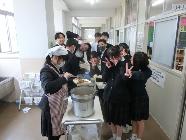 お昼休みのチャイムが鳴り、3年生の教室前で給食の準備が始まりました。今日は「豚と金時豆のカレーライス・ミニハンバーグ・キャベツとコーンのサワーソテー・梨」の人気メニュー。今日は可愛らしいハンバーグが付いているので、カレーと一緒に美味しいただきましょう。