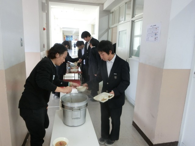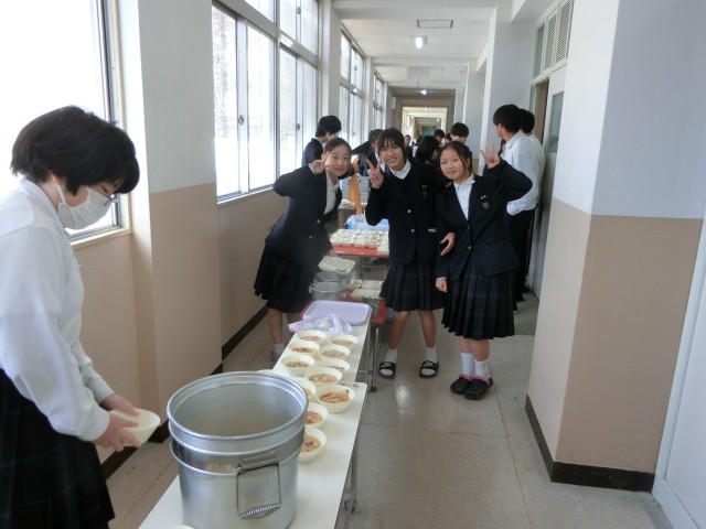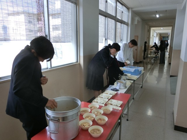 お昼休みのチャイムが鳴り、2年生の皆さんが給食の準備を行っています。今日は「お雑煮・ちらし寿司・ごまめ」のお正月メニュー。お雑煮は、鶏肉に金時ニンジン、里芋やお餅を煮込み、白味噌ベースの関西風に仕上げました。お正月をお祝いする行事献立をたくさんいただいてくださいね。