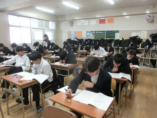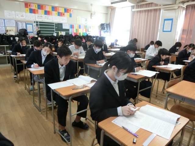 2年生の教室では社会のチャレンジテストが行われています。地理や歴史から幅広く問題が出題されているようです。授業で習った内容をよく思い出して、わかる問題・自信のある問題から解きましょう。選択問題は回答(記号)を書き間違えないよう、うっかりミスにも気をつけて!