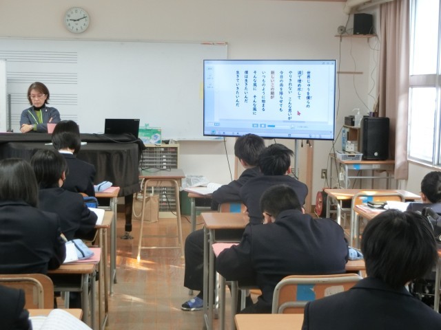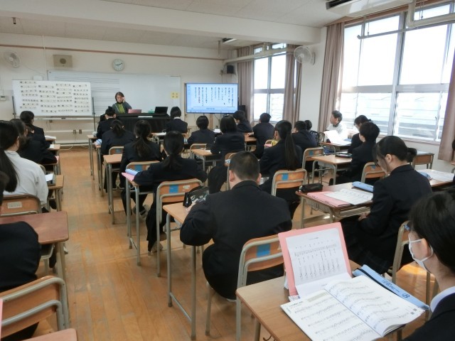音楽室から美しい歌声が聞こえてきました。3月に行われる「1年合唱コンクール」のクラスの課題曲が決まりました。1組では「6分の1の夢旅人 2002」という曲を歌います。テレビ番組から生まれた曲を新しいメロディーで作り直したものだそうです。みんなで気持ちを合わせて、練習に励みましょう。