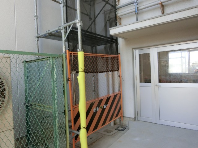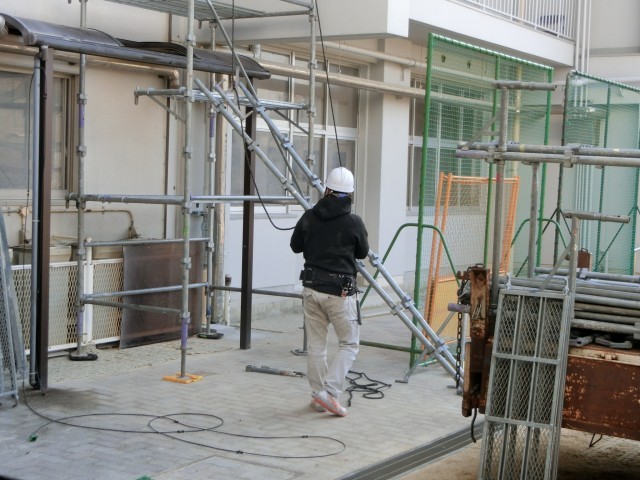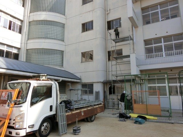 校舎の補修工事にむけた足場の設置が始まりました。旧校舎と新校舎の境目を東西からはさむように足場が組まれています。来週から本格的な作業がスタートする模様。作業車両の駐車もあり、しばらくの間、運動場東側(ウォータークーラー付近)を通る時は、気をつけてくださいね。
