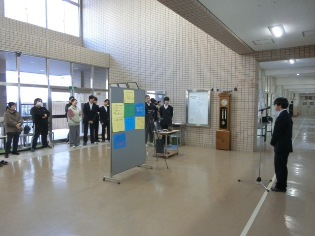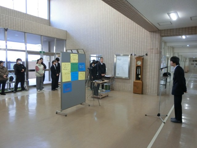 月曜日の朝は全校集会。今日は玄関ピロティと各教室をオンラインで結んで行われました。生徒会各委員会から「月間目標」の発表があり、「新しい年を迎え、学習や運動に取り組みましょう」との呼びかけがありました。1年で最も寒い時期を迎える中、教室の換気や手洗い・うがいなど、風邪の予防も心がけましょう。
