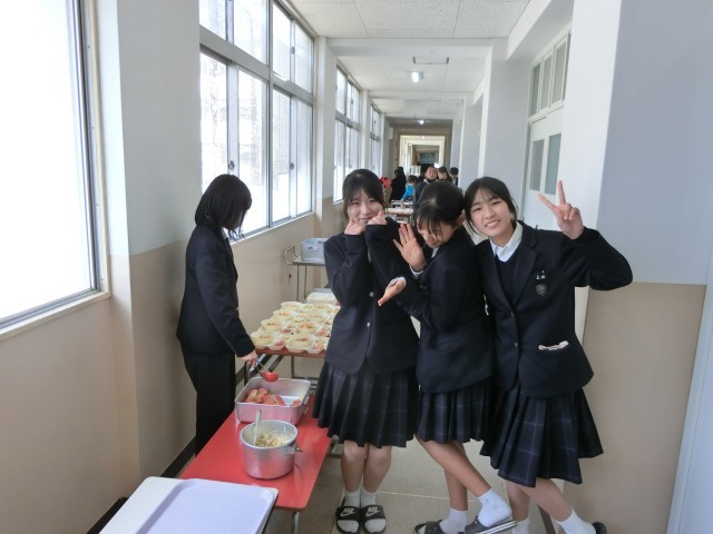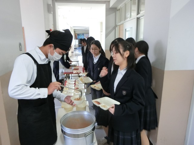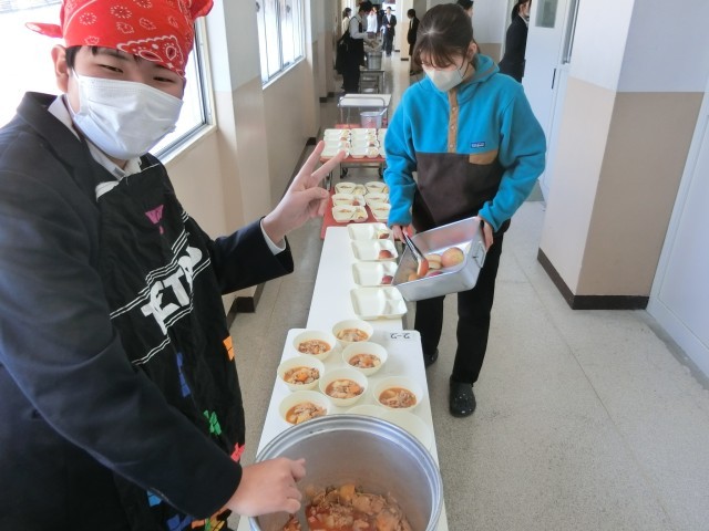 午前の授業が終わり、2年生の教室前で給食の準備が行われています。今日は「ケチャップ煮・ささみと野菜のソテー・リンゴ」の洋風献立。ワインで下味をつけた豚肉を、玉ねぎやニンジンと一緒に煮込んだケチャップ煮。味がしっかりしていてパンとの相性が良さそうですよ。