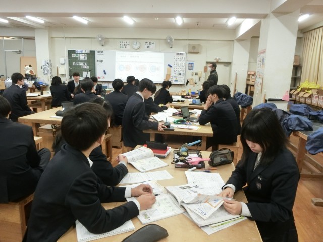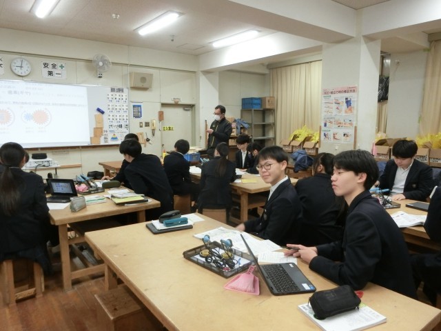 3年生技術科で「回転運動を伝える仕組み」について教わります。回転運動では主に「歯車(ギヤ)」を用います。歯の数が異なる歯車を組み合わせることで、回転数を調整することができるそうです。スクリーンに映された図を参考にしてくださいね。