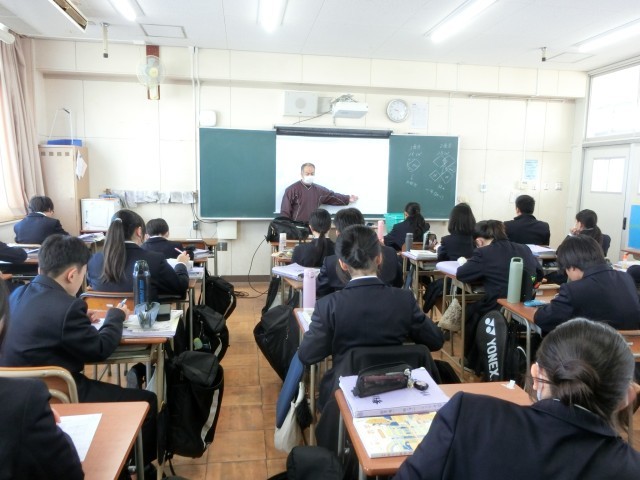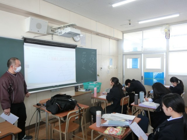 1年生数学の授業で「空間図形」について学習しています。空間図形とは高さや奥行きをもつ立体図形のことで複数の面があります。今日は「面と面の位置関係」を問う問題を解いていきます。面どうしが垂直に交わったり、平行であったりなど、いろんなパターンがあるようですね。