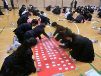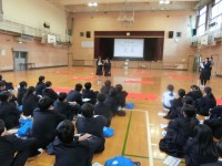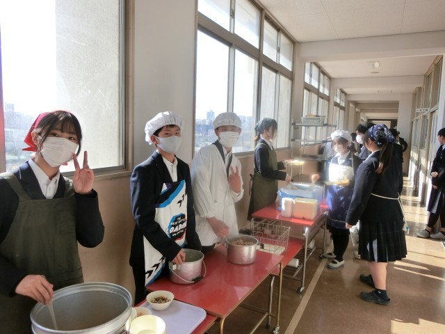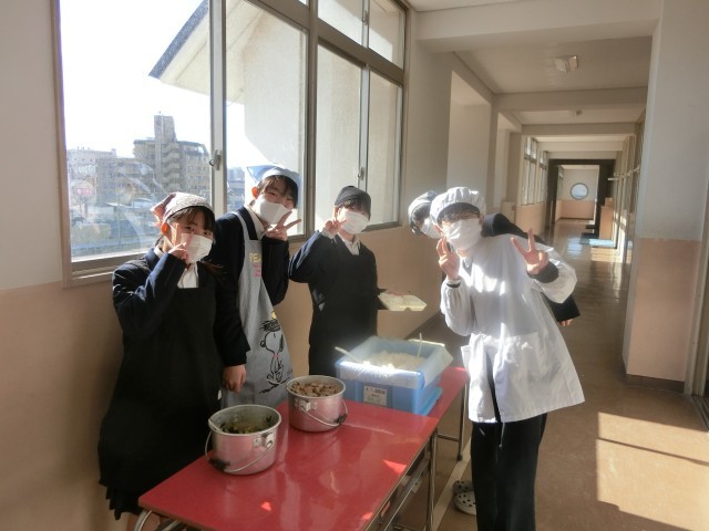 午前の授業が終わり、1年生の教室前で給食の配膳が始まりました。今日のメニューは「豚のスタミナ焼・鶏と薄揚げの五目汁・菊菜と白菜のおひたし」です。豚肉と玉ねぎをガーリック・お醤油・お味噌でしっかり炒めたスタミナ焼。白ご飯にもピッタリです。皆さんガッツリといただきましょう。