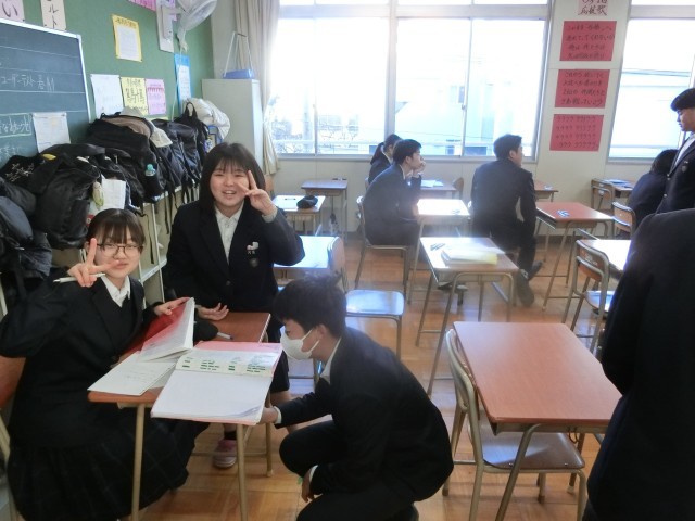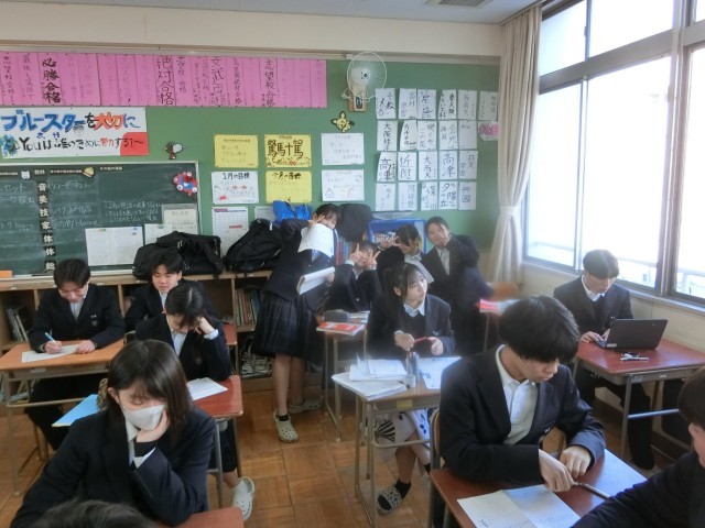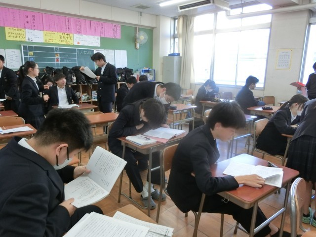 学年末テスト初日の朝。3年生教室では、開始直前の追い込みに取り組む姿が見られます。問題を出し合ったり、一緒にワークを確かめたり、いつもの風景が広がっています。