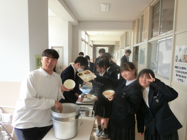 午前の授業が終わり、3年生の皆さんが給食の配食を行っています。今日のメニューは「小松菜っぱ飯・鮭フライのマリネ・ジャガイモと白菜、ベーコンのお味噌汁」。「学校給食献立コンクール」で優秀賞を受賞したそうです。皆さん、優秀賞のお味はいかがでしょう?