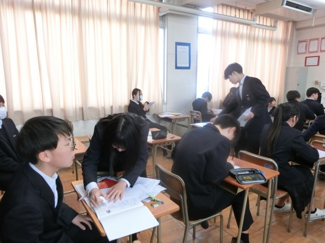 まもなく「保健体育」のテストが始まります。開始直前の教室では、体育科の先生作成の「テストに出るプリント」をチェックしています。実技や保健の授業で教わった内容など、いろんなポイントがまとめられているようです。中学校最後の定期テストが満足できる結果になりますように!
