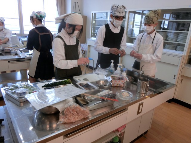 調理室で2年生の皆さんが調理実習を行っています。今回は「ブリの照り焼き・ほうれん草のお浸し・お吸い物」を作ります。まずは、かつお節と昆布でお出汁をとる作業から。調理室全体に美味しいお出汁の香りが広がってきましたよ。