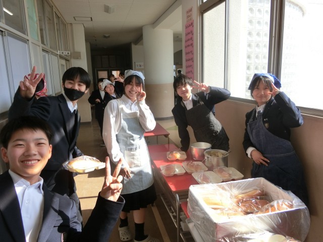お昼休みのチャイムが鳴り、1年生の皆さんが給食の準備を始めました。今日は「豚のカレー風味焼・コーンと野菜のスープ・カリフラワーのピクルス」の洋風メニュー。豚肉にカレー粉をまぶして下味をつけ、しっかりと焼き上げたカレー風味焼は香りが抜群。パンとの相性も良さそうです。