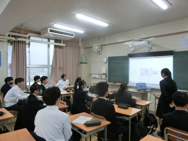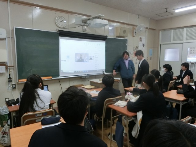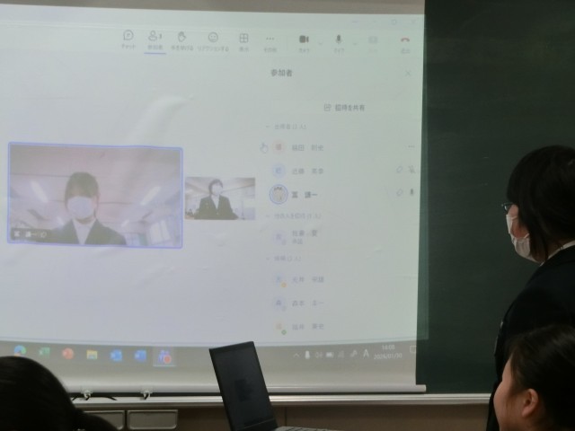 2年生の皆さんが、校区の小学6年生と英語で交流しています。中学校と小学校をオンラインで結んで、互いにコミュニケーションをはかります。使用する言葉はもちろん英語。「1つの授業時間は何分ですか」「1日どのくらい授業がありますか」など、中学校生活への質問が多かったですね。