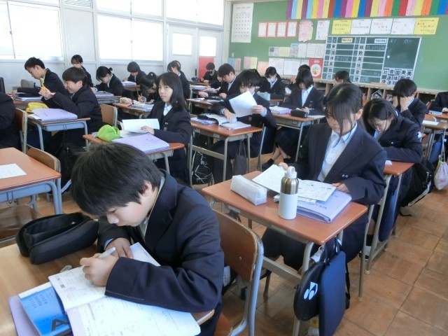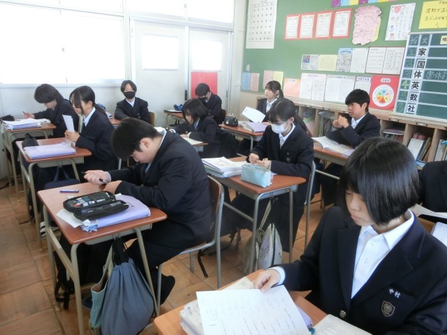 1年生数学の授業で「ワーク」の問題に取り組んでいます。今学期は空間図形などの問題を解いてきました。先生から今月末に実施する学年末テストの予告がありました。「ワークの〇〇ページまでがテスト範囲です」とのこと。皆さん、しっかりメモをとって来るべきテストに備えましょう。