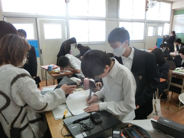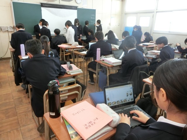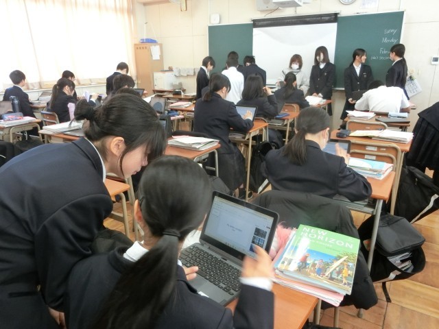 1年生英語の授業で「My winter vacation」をテーマに、冬休みのできごとをタブレット端末でまとめます。初詣にでかけたり、家族や友達と過ごした思い出を英語で表現します。わからない表現は先生に尋ねてくださいね。