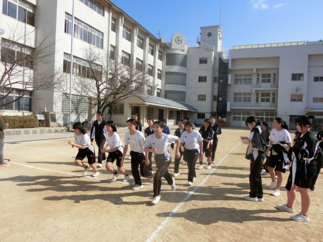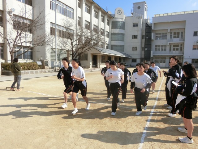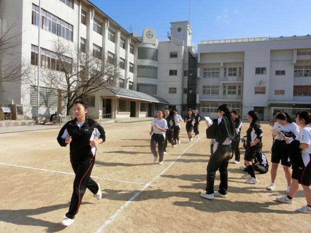 3年生女子の皆さんが運動場に集まってきました。これから「1000m」のタイムを測ります。「走る人・記録を取る人」の2グループに分かれてトラック6周と少しを走ります。持久走の授業も今日が最後。皆さんにとって中学校生活のラストランになりますね。
