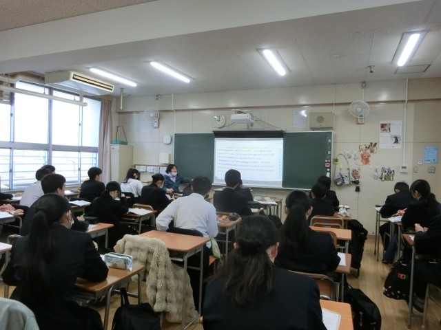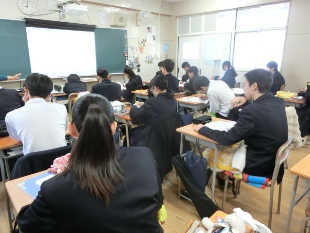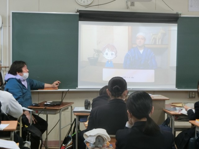 2年生英語の授業で「受け身(受動態)」について学習中。「be動詞+過去分詞」で「~される」という意味を持ちます。スクリーンには「受け身」の説明動画が映されています。皆さん、受け身の英文の使い方がわかりましたか??