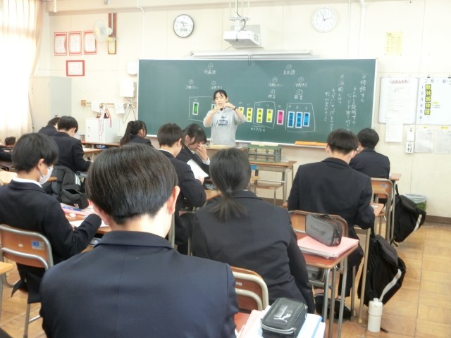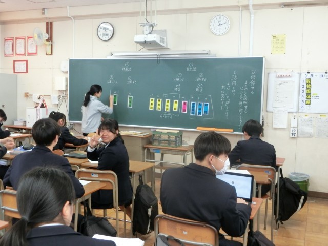3年生国語の授業で文法のおさらいをしています。今日は以前習った「品詞の分類」を復習します。役割によって分類された品詞のカードが黒板に並べられます。カードが色分けされているので、どのグループに属するかが良く分かりますね。