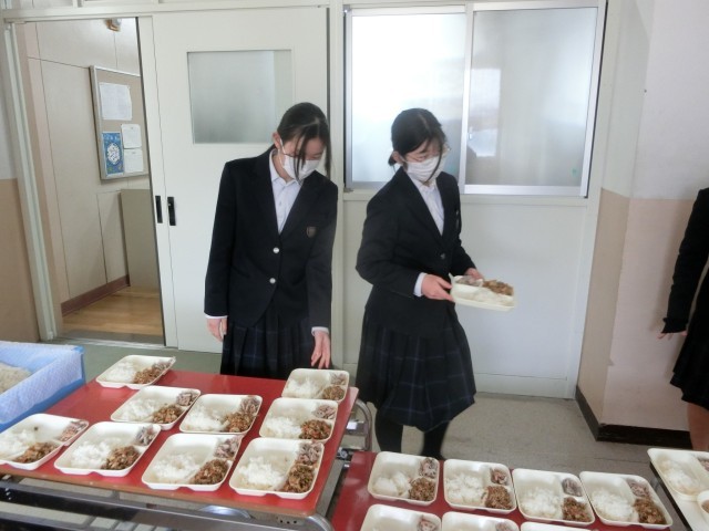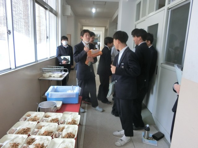 お昼休みのチャイムが鳴り、2年生の教室前で給食の準備が始まりました。今日は「鶏ごぼうご飯・豚と白菜のお味噌汁・焼きレンコン」の和風メニュー。鶏そぼろ・ゴボウ・こんにゃくを甘辛く煮込みました。昆布と削り節の香りが良いですね。ご飯にしっかりまぜていただきましょう。