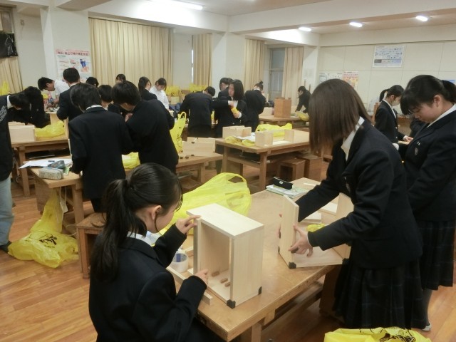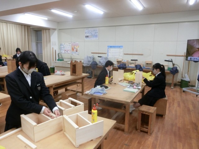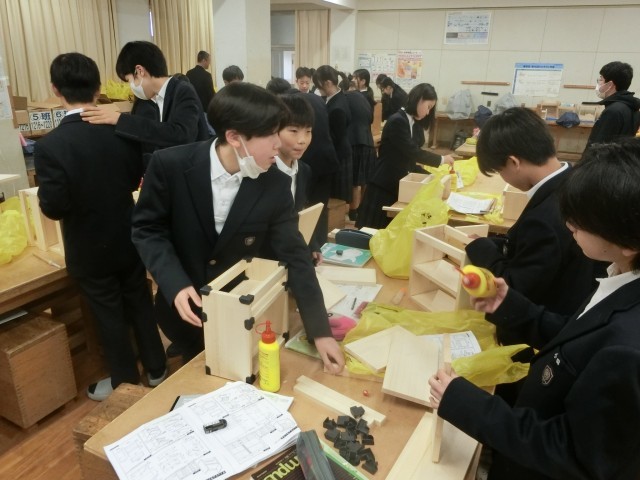 1年生技術科で制作している「木製ラック」。それぞれが考えたデザインに沿ってパーツを削り、組み立てる作業に入っています。完成した形が見えてきた人もいるようです。皆さん、作業は順調に進んでいますか?
