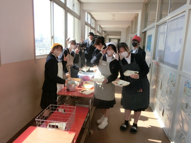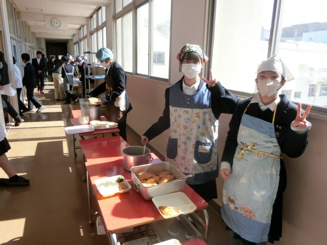 お昼休みのチャイムが鳴り、1年生の教室前で給食の準備が始まりました。今日は「タラのフライ・鶏と野菜のくず汁・小松菜のゴマ和え・おさつチップス」をいただきます。鱈(タラ)は白身の魚で、あっさりとした淡白な味わい。油でカラッと揚げているので、さっくりした食感を楽しみましょう。