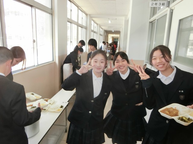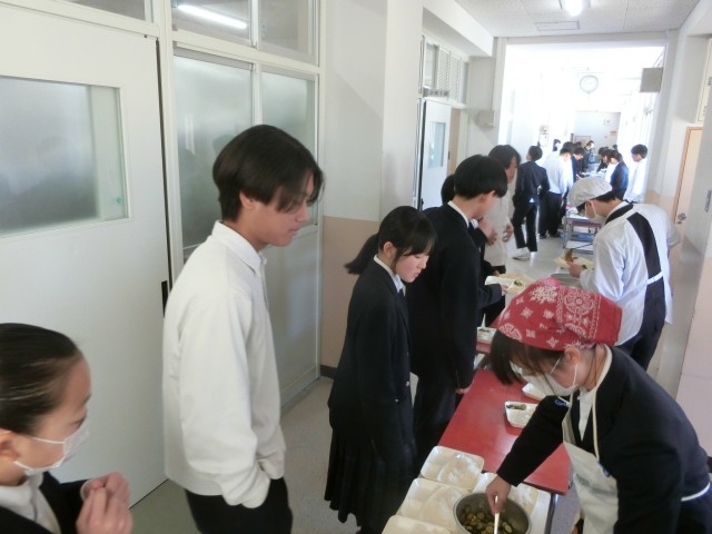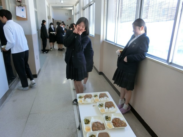 午前の授業が終わり、2年生の教室前で給食の準備が行われています、今日は「チキンレバーカレー・キュウリとコーンのサラダ・洋ナシ」の人気メニュー。ペースト状の鶏レバーとたっぷりのお野菜をコトコト煮込んだカレーライス。ご飯大盛りでいただきましょう。